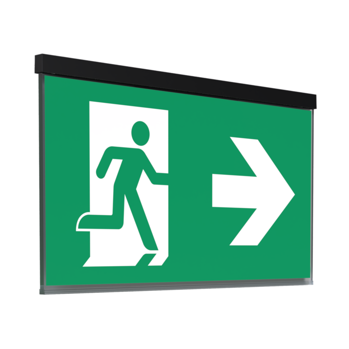 Moderne Zink-Druckguss Rettungszeichenleuchte für die Wandeinbaumontage, zur Kennzeichnung von Rettungs- und Fluchtwegen.