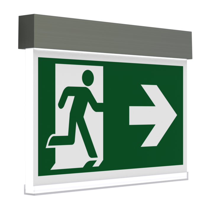 Automatische Überwachung der Sicherheitsleuchte mit SelfControl. Planungssicherheit ist durch werkzeuglosen, variablen Einsatz der Piktogramme vor Ort gegeben. Die Piktogramme entsprechend DIN ISO 7010 (Pfeil rechts, links, unten und oben) sind standardmäßig im Lieferumfang enthalten. Auf Anfrage kann die Beschriftung auch nach Kundenvorgabe erfolgen.