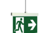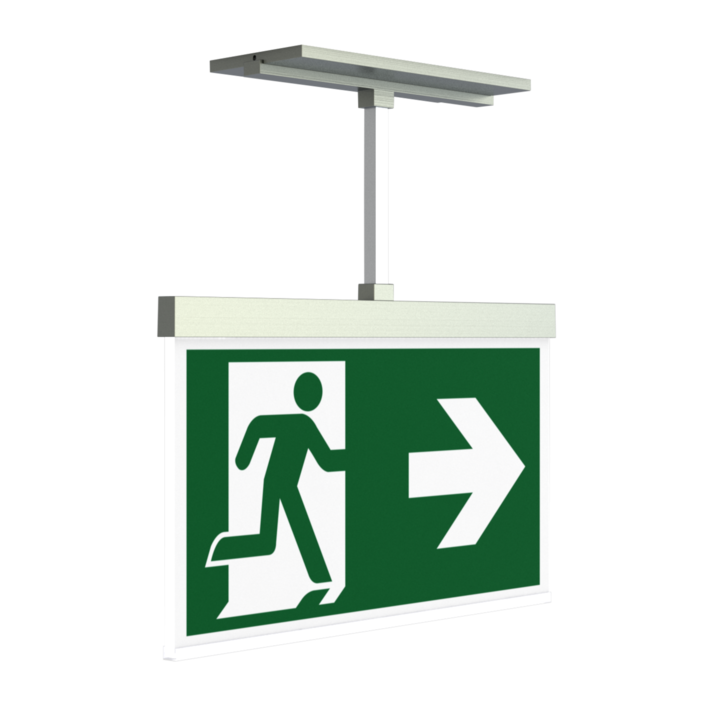 Moderne Zink-Druckguss Rettungszeichenleuchte mit Pendel zur Deckeneinbaumontage. Die Kennzeichnung der Rettungs- und Fluchtwege kann wahlweise ein- oder beidseitig erfolgen.