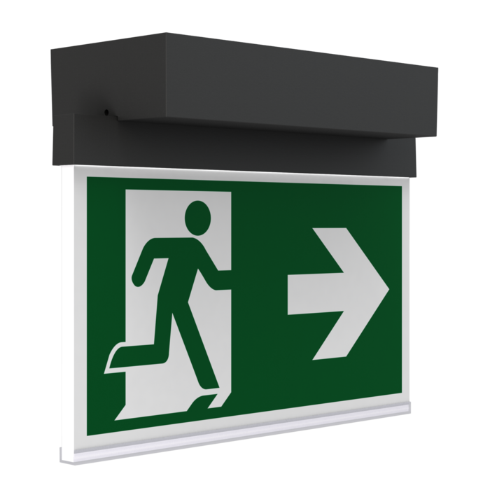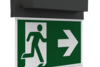 Moderne Zink-Druckguss Rettungszeichenleuchte zur Deckenaufbaumontage. Die Kennzeichnung der Rettungs- und Fluchtwege kann wahlweise ein- oder beidseitig erfolgen.