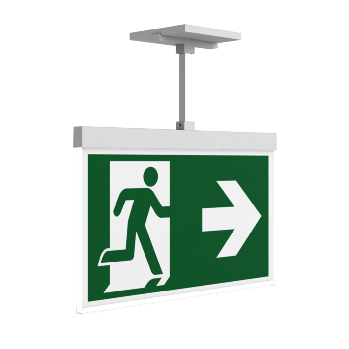 Automatische Überwachung der Sicherheitsleuchte mit SelfControl. Planungssicherheit ist durch werkzeuglosen, variablen Einsatz der Piktogramme vor Ort gegeben. Die Piktogramme entsprechend DIN ISO 7010 (Pfeil rechts, links, unten und oben) sind standardmäßig im Lieferumfang enthalten. Auf Anfrage kann die Beschriftung auch nach Kundenvorgabe erfolgen.