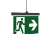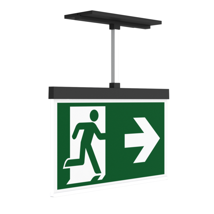 Moderne Zink-Druckguss Rettungszeichenleuchte mit Pendel zur Deckeneinbaumontage. Die Kennzeichnung der Rettungs- und Fluchtwege kann wahlweise ein- oder beidseitig erfolgen.