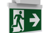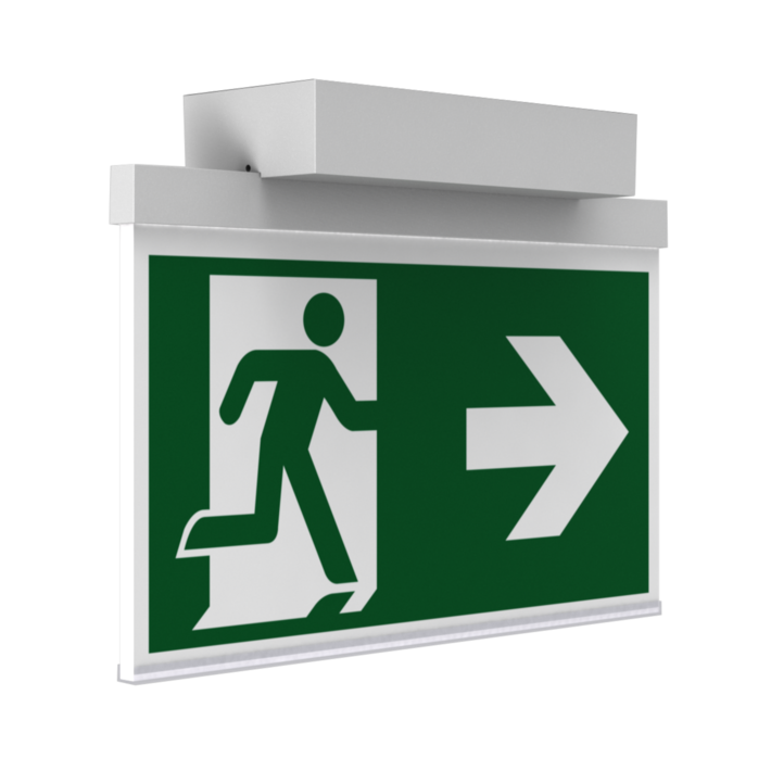 Moderne Zink-Druckguss Rettungszeichenleuchte zur Deckenaufbaumontage. Die Kennzeichnung der Rettungs- und Fluchtwege kann wahlweise ein- oder beidseitig erfolgen.