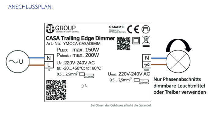 Der CASA Trailing Edge Dimmer ist ein Phasenabschnittsdimmer. Sein Einsatz ermöglicht stufenloses Dimmen von Phasenabschnittsleuchtmitteln. Ausgangsleistung 150W LED / 200W ohmisch (z.B Glühbirnen). Gesteuert wird er drahtlos mit der CASAMBI® App. Zugentlastung und Klemmenabdeckung sind integriert.