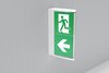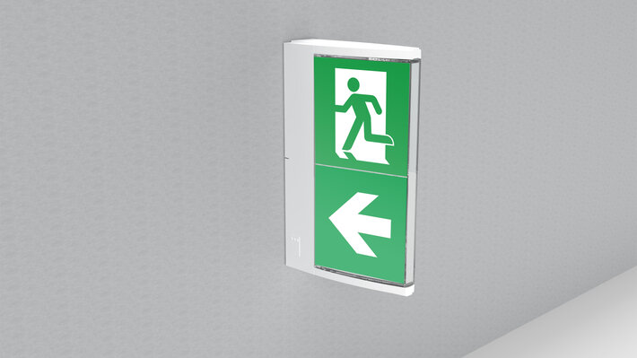 Design and function-optimized convex exit sign with a clear, closed cover that tapers symmetrically towards the bottom. The screwed cover ensures stability and a high IP protection class, while the functional technology remains unobtrusive and no screws are visible from the outside. The pictograms are on the inside and are inserted solvent-free for one- or two-sided labeling.