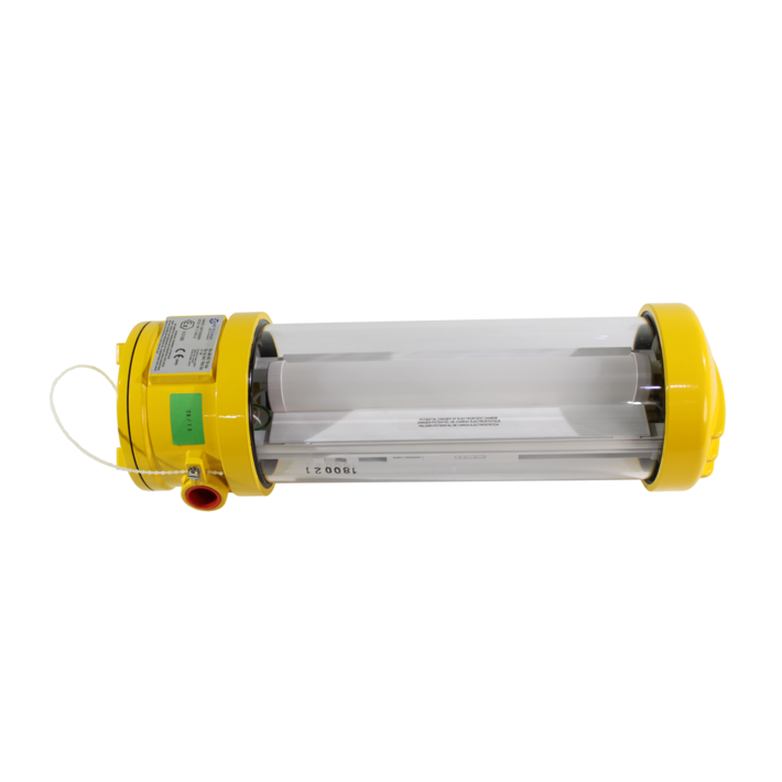 Polycarbonate cylinder safety luminaire with explosion protection for gas and dust Ex zones.