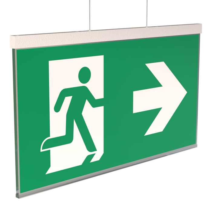 Luminaire moderne à pictogramme de secours en zinc moulé sous pression avec suspension par câble pour montage encastré au plafond. La signalisation des issues de secours et des voies d’évacuation s’effectue au choix sur une face ou sur les deux faces.