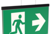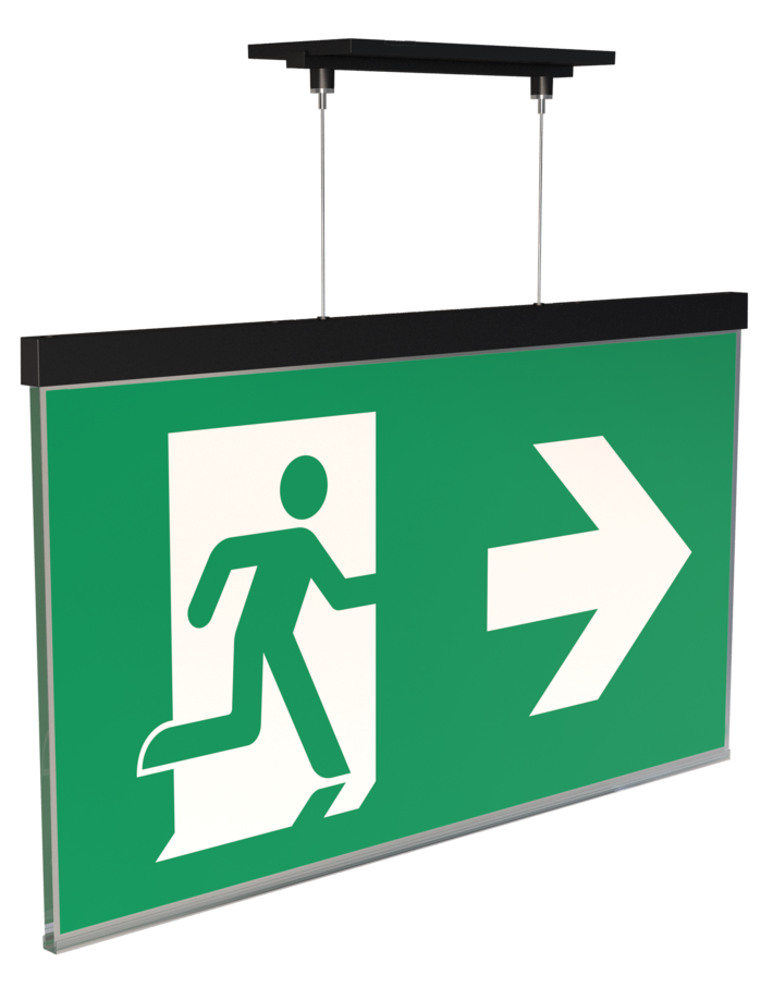 Luminaire moderne à pictogramme de secours en zinc moulé sous pression avec suspension par câble pour montage encastré au plafond. La signalisation des issues de secours et des voies d’évacuation s’effectue au choix sur une face ou sur les deux faces.