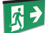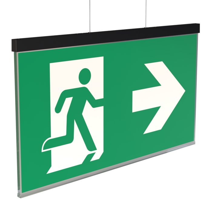 Luminaire moderne à pictogramme de secours en zinc moulé sous pression avec suspension par câble pour montage en saillie au plafond. La signalisation des issues de secours et des voies d’évacuation s’effectue au choix sur une face ou sur les deux faces.