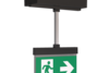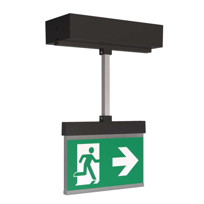 Luminaire moderne à pictogramme de secours en zinc moulé sous pression avec suspension pour montage en saillie au plafond. La signalisation des issues de secours et des voies d’évacuation s’effectue au choix sur une face ou sur les deux faces.