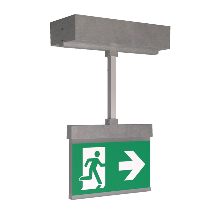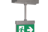 Luminaire moderne à pictogramme de secours en zinc moulé sous pression avec suspension pour montage en saillie au plafond. La signalisation des issues de secours et des voies d’évacuation s’effectue au choix sur une face ou sur les deux faces.