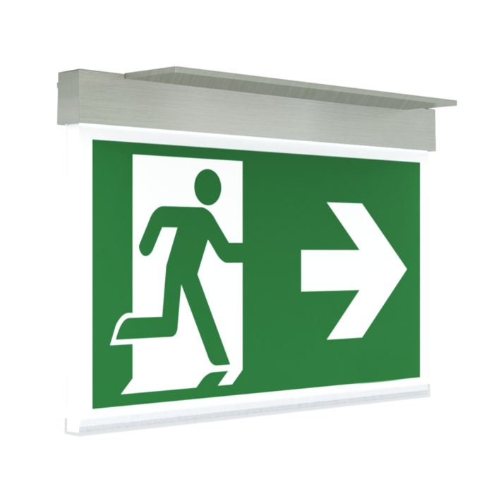 Luminaire moderne à pictogramme de secours en zinc moulé sous pression pour montage encastré au plafond. La signalisation des issues de secours et des voies d’évacuation s’effectue au choix sur une face ou sur les deux faces.