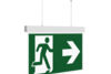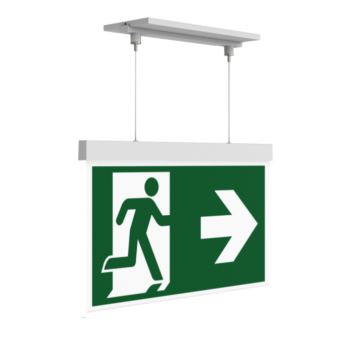 Luminaire moderne à pictogramme de secours en zinc moulé sous pression avec suspension par câble pour montage encastré au plafond. La signalisation des issues de secours et des voies d’évacuation s’effectue au choix sur une face ou sur les deux faces.