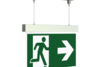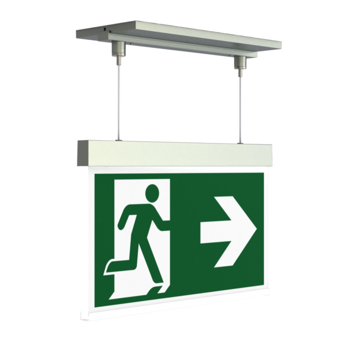 Luminaire moderne à pictogramme de secours en zinc moulé sous pression avec suspension par câble pour montage encastré au plafond. La signalisation des issues de secours et des voies d’évacuation s’effectue au choix sur une face ou sur les deux faces.