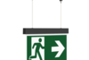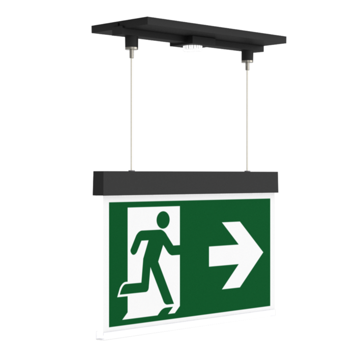 Luminaire moderne à pictogramme de secours/de sécurité en zinc moulé sous pression avec suspension par câble pour montage encastré au plafond. La signalisation des issues de secours et des voies d’évacuation s’effectue au choix sur une face ou sur les deux faces. La technologie Duo assure, à l’aide d’une LED supplémentaire, la signalisation lumineuse des voies d’évacuation et des issues de secours en cas de panne de courant.