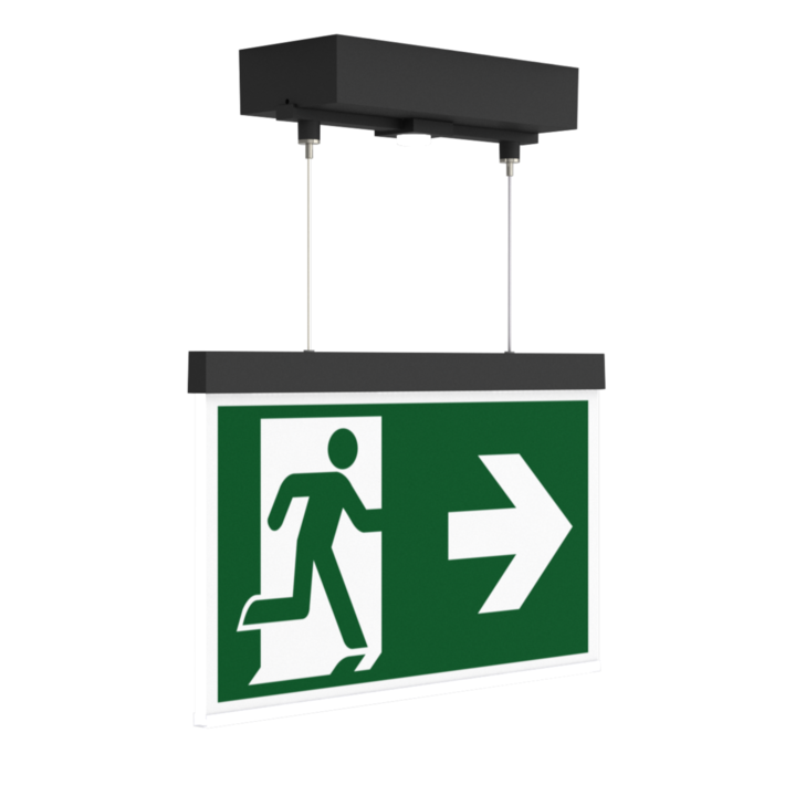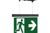 Luminaire moderne à pictogramme de secours/de sécurité en zinc moulé sous pression avec suspension par câble pour montage en saillie au plafond. La signalisation des issues de secours et des voies d’évacuation s’effectue au choix sur une face ou sur les deux faces. La technologie Duo assure, à l’aide d’une LED supplémentaire, la signalisation lumineuse des voies d’évacuation et des issues de secours en cas de panne de courant.