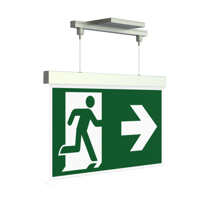 Luminaire moderne à pictogramme de secours en zinc moulé sous pression avec suspension par câble pour montage encastré au plafond. Grâce à son diamètre d’encastrement de 68 mm, ce luminaire s’intègre élégamment dans de nombreux environnements. La signalisation des issues de secours et des voies d’évacuation s’effectue au choix sur une face ou sur les deux faces.