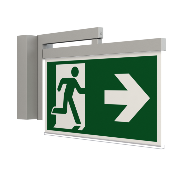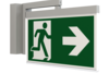 Luminaire moderne à pictogramme de secours en zinc moulé sous pression pour montage mural en saillie. La signalisation des issues de secours et des voies d’évacuation s’effectue en angle droit par rapport au mur grâce au support mural, au choix sur une face ou sur les deux faces.