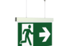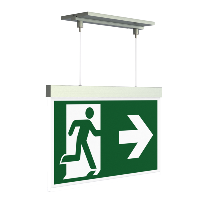 Luminaire moderne à pictogramme de secours en zinc moulé sous pression avec suspension par câble pour montage encastré au plafond. La signalisation des issues de secours et des voies d’évacuation s’effectue au choix sur une face ou sur les deux faces.