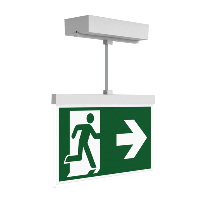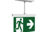 Luminaire moderne à pictogramme de secours en zinc moulé sous pression avec suspension pour montage en saillie au plafond. La signalisation des issues de secours et des voies d’évacuation s’effectue au choix sur une face ou sur les deux faces.