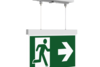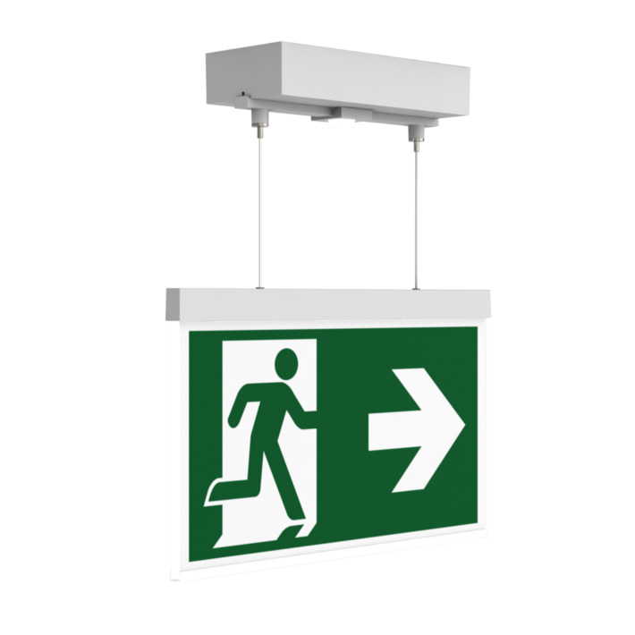 Luminaire moderne à pictogramme de secours/de sécurité en zinc moulé sous pression avec suspension par câble pour montage en saillie au plafond. La signalisation des issues de secours et des voies d’évacuation s’effectue au choix sur une face ou sur les deux faces. La technologie Duo assure, à l’aide d’une LED supplémentaire, la signalisation lumineuse des voies d’évacuation et des issues de secours en cas de panne de courant.