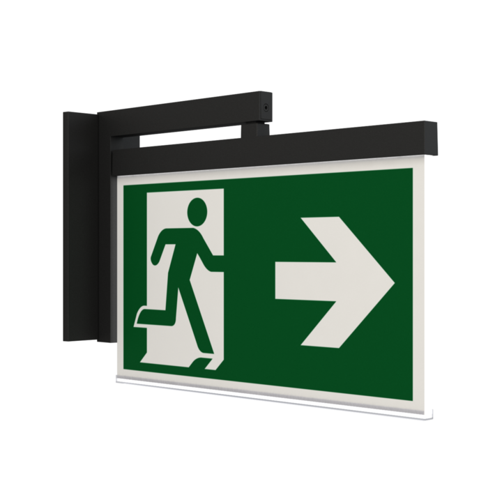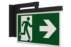 Luminaire moderne à pictogramme de secours en zinc moulé sous pression pour montage mural encastré. La signalisation des issues de secours et des voies d’évacuation s’effectue en angle droit par rapport au mur grâce au support mural, au choix sur une face ou sur les deux faces.