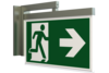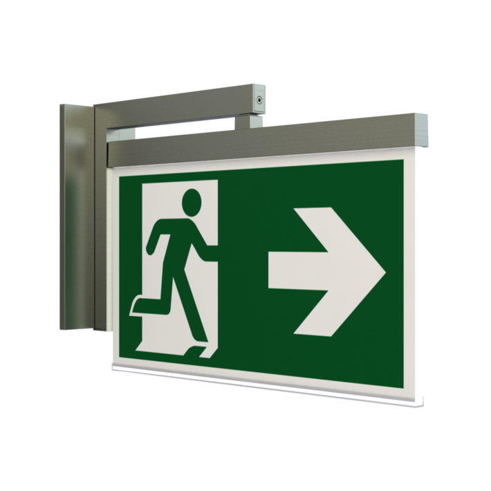 Luminaire moderne à pictogramme de secours en zinc moulé sous pression pour montage mural encastré. La signalisation des issues de secours et des voies d’évacuation s’effectue en angle droit par rapport au mur grâce au support mural, au choix sur une face ou sur les deux faces.