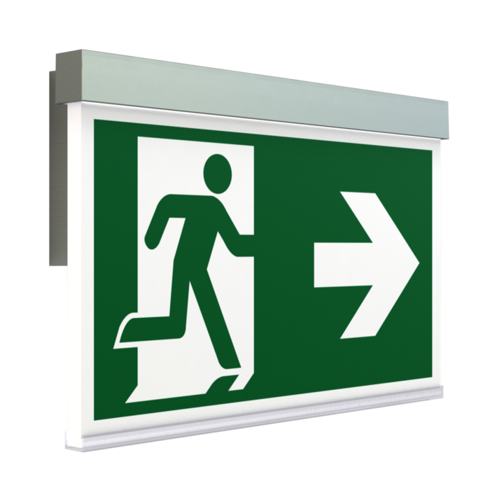 Luminaire moderne à pictogramme de secours en zinc moulé sous pression pour montage mural, pour la signalisation des issues de secours et des voies d’évacuation.