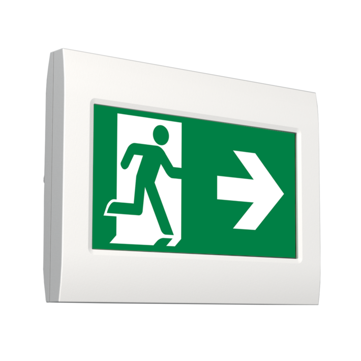 Surveillance automatique de la lampe de sécurité avec SelfControl. Impossible de se tromper lors de la planification grâce aux pictogrammes logiques imprimés. Les pictogrammes conformes à la norme DIN ISO 7010 (flèches à droite, à gauche et en bas) sont contenus dans la livraison standard. L’impression peut également être faite sur demande en fonction des prescriptions du client.