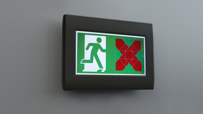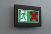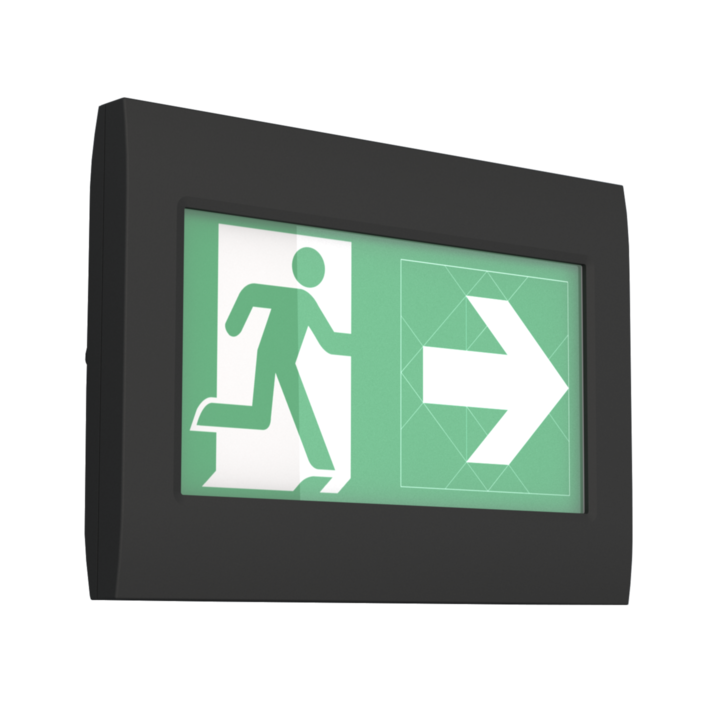Luminaire robuste à pictogramme de secours en zinc moulé sous pression pour l’affichage dynamique des voies d’évacuation.
