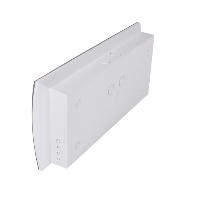 Utilisation comme luminaire à pictogramme de secours pour montage mural. Le set de pictogrammes s’insère à l’intérieur sans recours à un quelconque dissolvant pour adhésif.