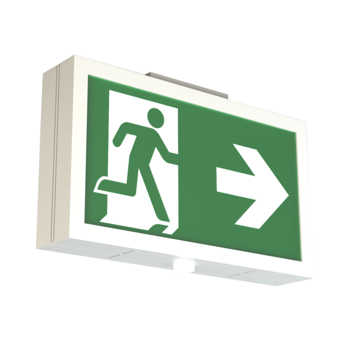 Luminaire à pictogramme de secours fin en zinc moulé sous pression avec design moderne pour montage au plafond. Pour marquage monoface ou biface.